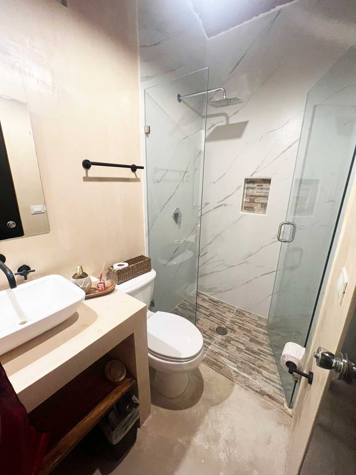 Para tu comodidad, el cuarto cuenta con Wi-Fi gratuito, una televisión de pantalla plana con canales por cable, y ventilador de techo y aire acondicionado. El baño privado, decorado con materiales naturales como chukum y detalles de concreto, madera y ceramica, ofrece un espacio funcional y elegante.