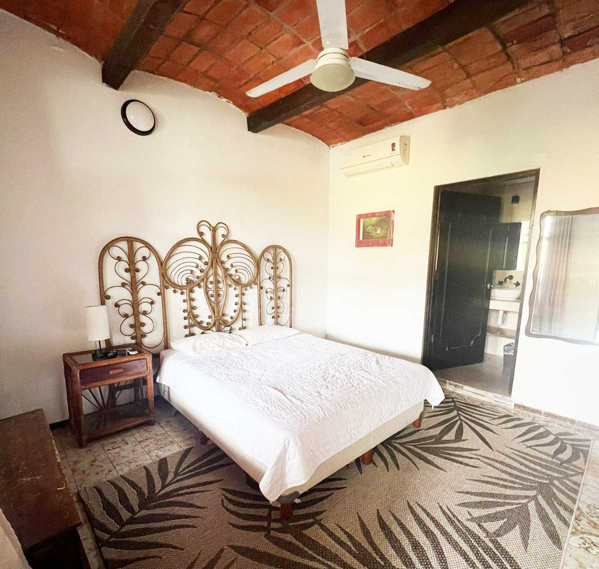 El cuarto con el mismo estilo rústico, cuenta con una decoración cálida y acogedora. Las paredes están adornadas con estuco en tonos cálidos mientras que los muebles hechos de ratán por artesanos mexicanos añaden un toque artesanal que completan el ambiente con un toque tradicional y hogareño.